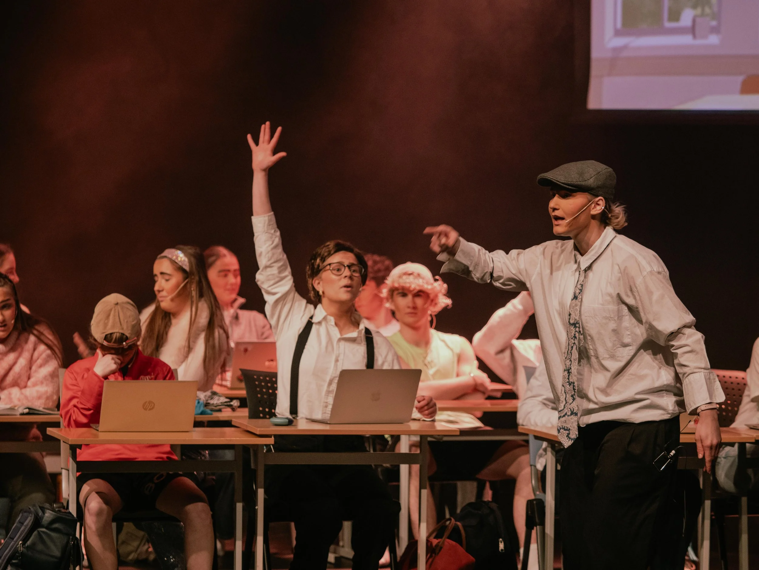 Etter skolesekken ble det raking for våren med Kjell Magne og dans mens rivene sang. Etterpå var det duket for den obligatoriske fotballkampen, før Tobias og Emilie fikk returnert til 2060. Det ble et verdig punktum da den magiske årboken serverte oss rørende minner fra det vidunderlige skoleåret 2025/26. Alt ordnet seg selvsagt til slutt slik det skal i ordentlige revyer.
