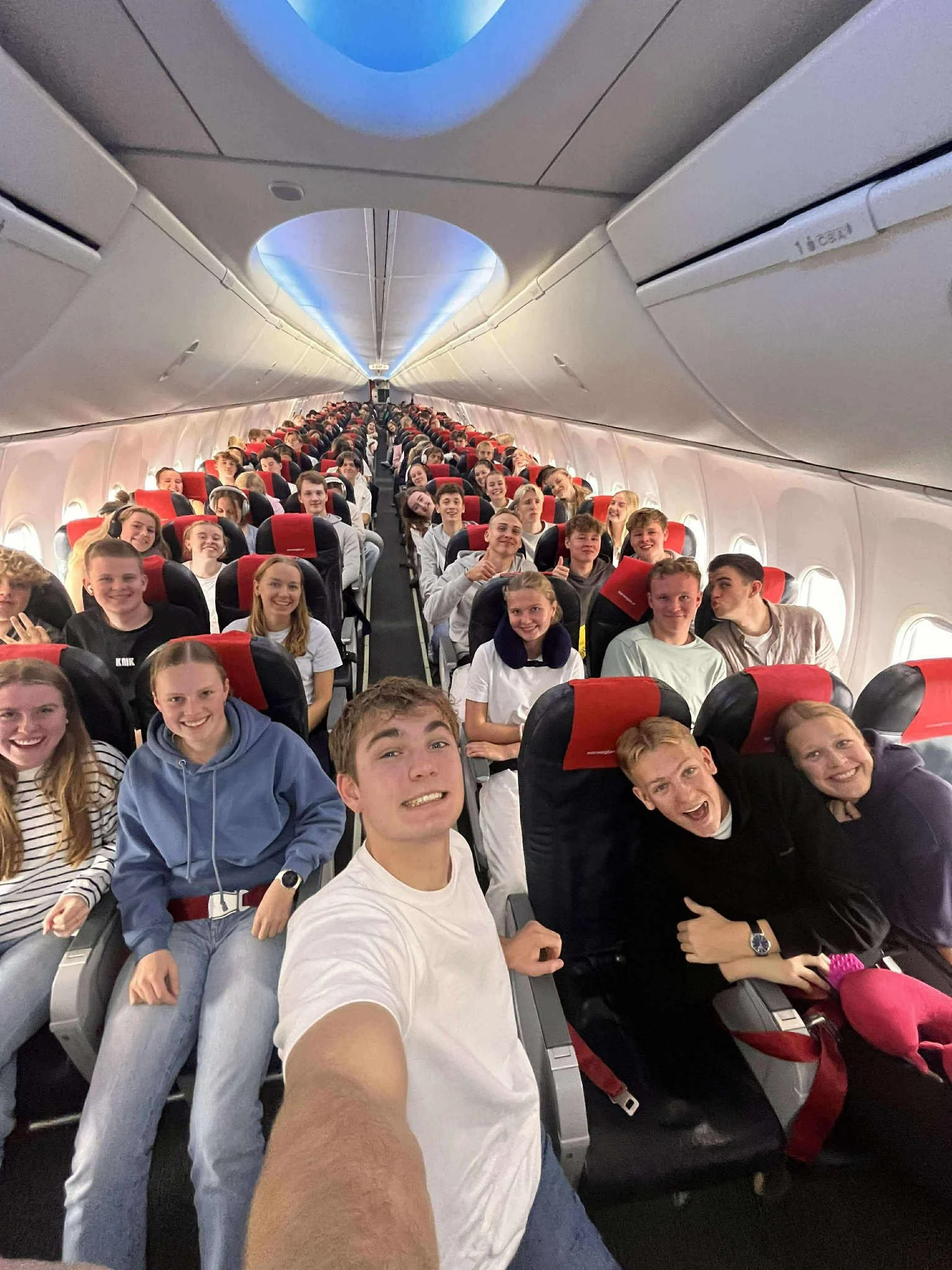 Humøret på flyturen var upåklagelig, tonen var lett og ledig, mange blide og forventningsfulle ungdommer som ser frem til sol og leksefri. Vi lærere har også gledet oss.
